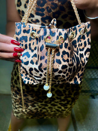 Make a bold statement with the Chain Reaction Leopard Mini Bucket Bag—where wild print meets luxe edge. Featuring a chic drawstring closure, adjustable design, and striking gold chain strap, this bag blends fierce energy with everyday function. Crafted from 100% polyamide, it’s the perfect mini shoulder bag to elevate your outfit with untamed glamour.
