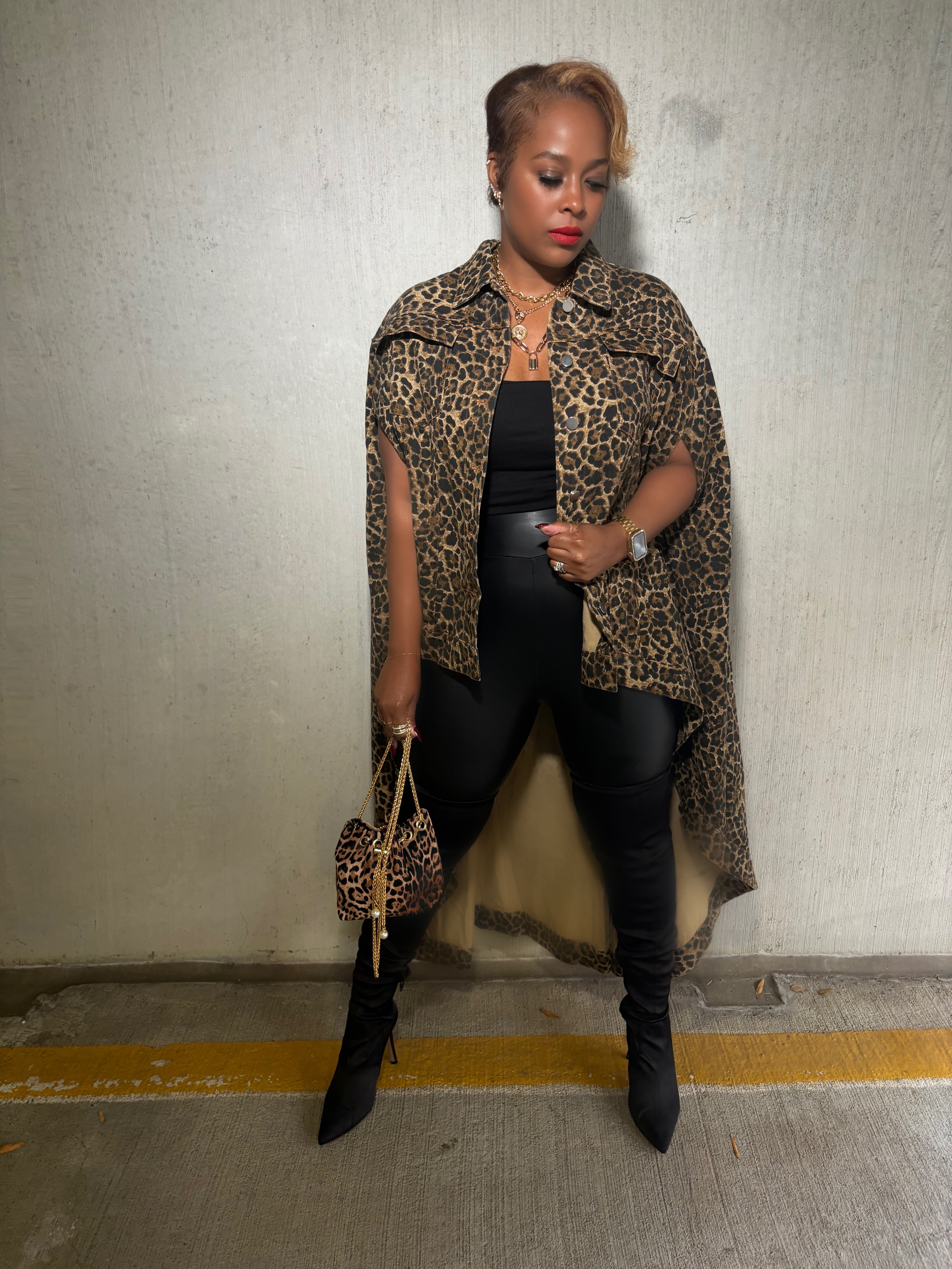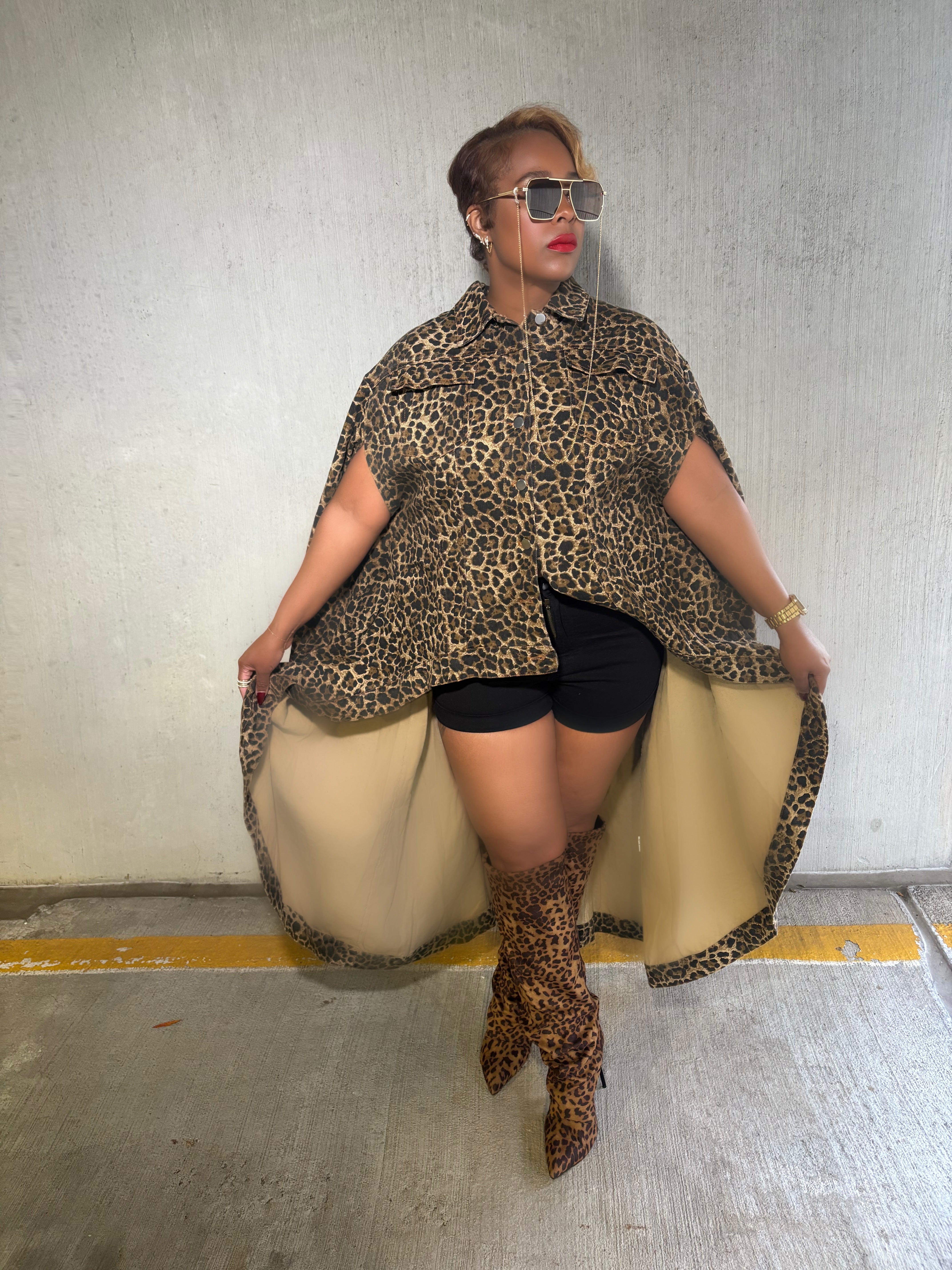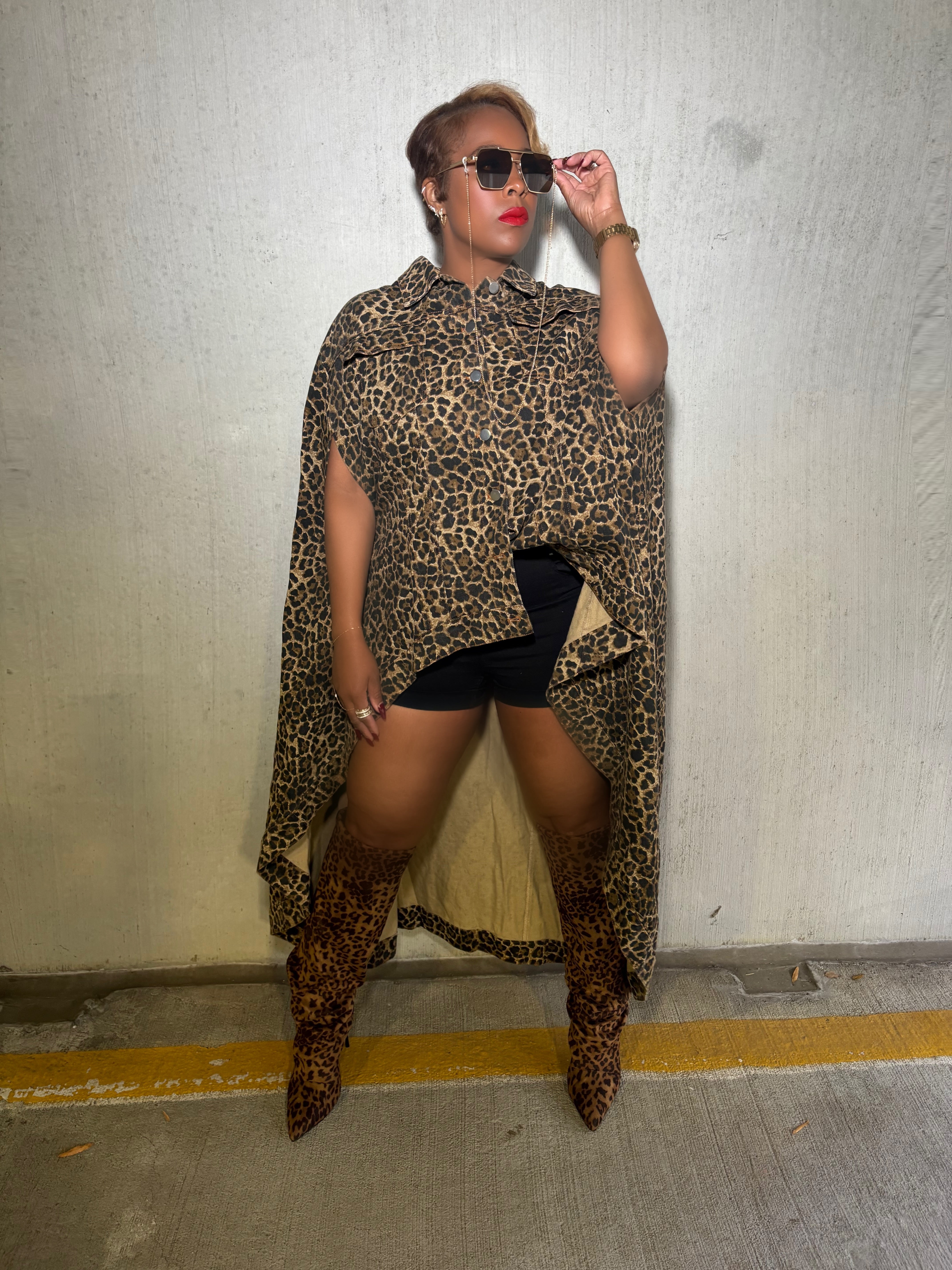 Unleash your wild side with our High-Low Leopard Print Jacket Cape — where bold meets refined edge. Crafted from premium, structured fabric with a striking high-low hem and front button closure, this jacket cape delivers fierce style and lasting quality. Perfect for those who own their confidence and demand standout, sophisticated outerwear.